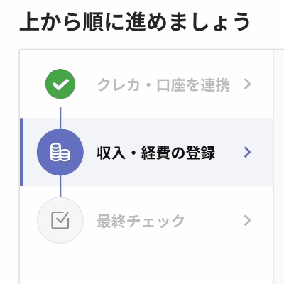 3つ目のステップ「収入・経費の登録」が完了していません。まずは「収入・経費の登録」を完了させましょう。
